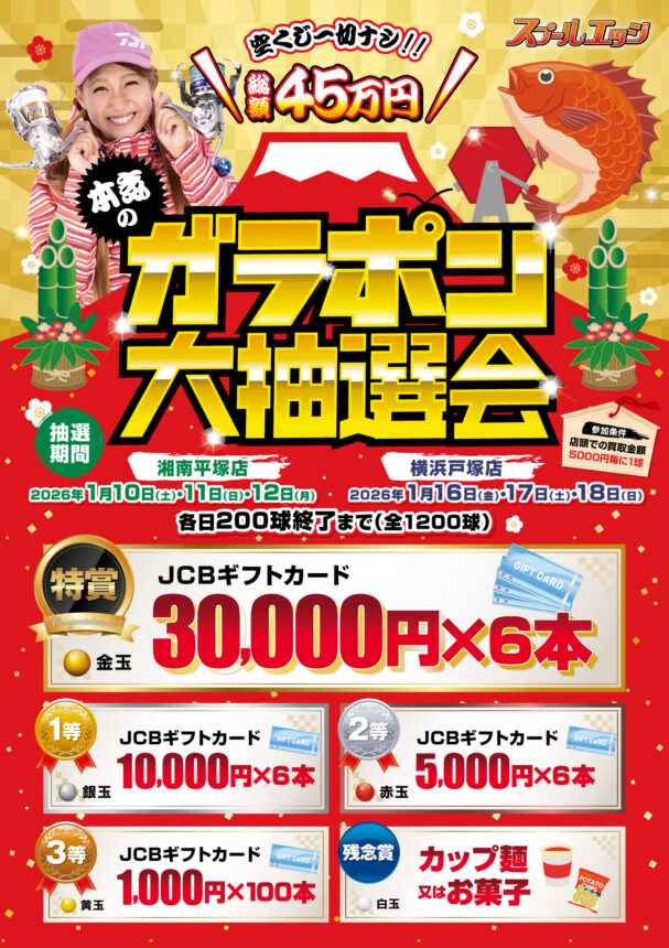 2026年1月10日(土) ★【湘南平塚店】→ガラポン大抽選会 10時~18時30分 /【横浜戸塚店】→通常営業 10時~17時